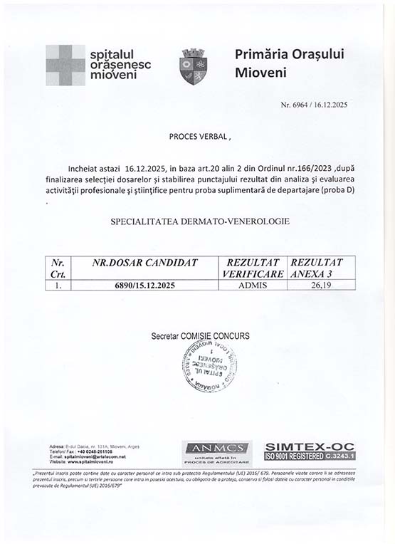 Spital Mioveni  > Carieră / Anunțurile posturilor scoase la concurs 2025 >  REZULTATE SELECTIE DOSAR CONCURS MEDIC DERMATOVENEROLOGIE
